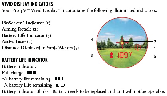 The Bushnell Pro 1M joins the lineup of the “#1 Rangefinder on Tour” with minor enhancements to the prior generation Bushnell 1600 Tournament Edition. Like the 1600 Tournament Edition, the Pro 1M is legal for tournament play, as it does not provide slope-adjusted distances. The biggest change from the prior product is the introduction of Bushnell’s “Vivid Display Technology,” which displays distances and other information in the viewfinder in red, as opposed to the previous black LCD display. The improved display, the 7x magnification and the large field of view are the device’s strengths. The Pro 1M is horizontally-held, like a pair of binoculars.